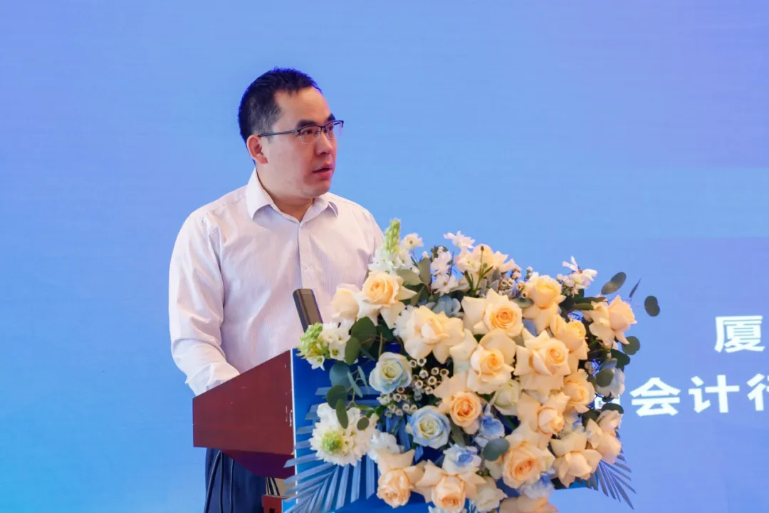 正保集团高级副总裁、厦门网中网软件有限公司总裁,全国会计行业产教融合共同体理事长单位代表蔡理强致辞,集团将继续以产教融合为主线,促进院校和产业、理论教学和实践教学的融合,积极探索新的教育模式和教育方法,适应数字化、智能化时代的教育需求,为促进教育高质量发展作出努力。