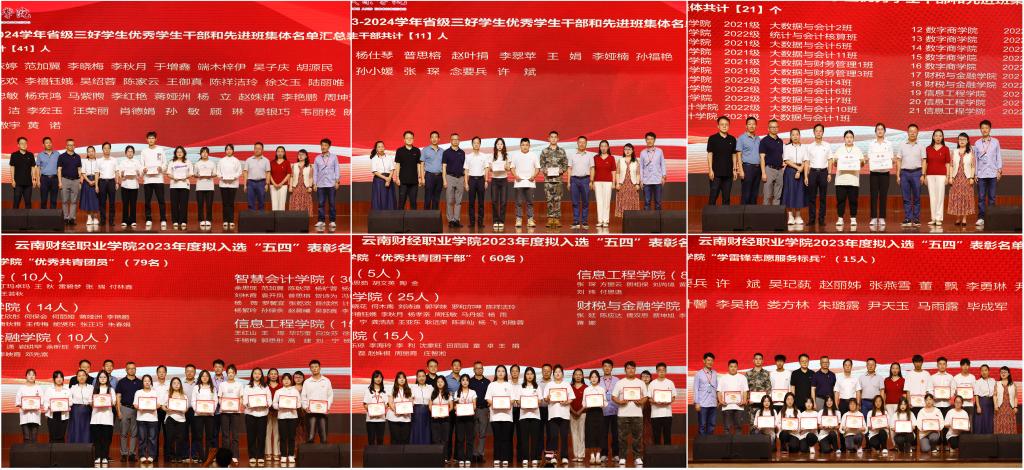在五四表彰环节对获得2023-2024学年省级和校级各项荣誉的先进集体和个人进行表彰。党委副书记仲新、组织部、宣传部、学工部、各二级学院负责人为获得省级和校级共青团表彰的集体和个人代表颁奖。