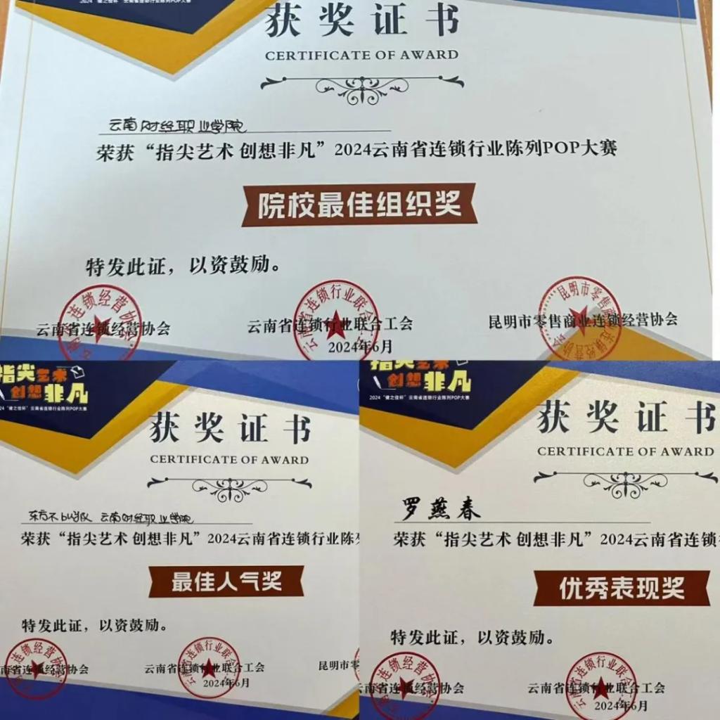 6月22日,以“指尖艺术 创想非凡”为主题的2024云南省连锁行业陈列POP大赛在昆明举办。本次活动由云南省商务厅指导,昆明市商务局携手云南省连锁经营协会等多家行业协会、企业及高校共同支持,经过激烈角逐,我校共有两支队伍进入决赛。在此次竞赛中,我校数字商学院2022级网络营销与直播电商专业参赛选手荣获最佳人气奖等奖项各3项。