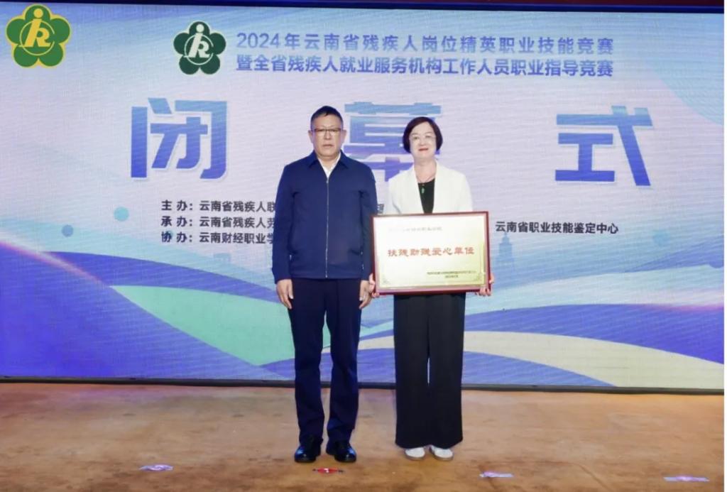我校作为协办单位,不仅提供了完善的设施和优质的服务,也为参赛者和就业服务机构工作人员提供了全方位的支持。在闭幕式上,云南省残疾人联合会领导对我校的出色工作给予了高度评价,并授予我校“扶残助残爱心单位”荣誉。
