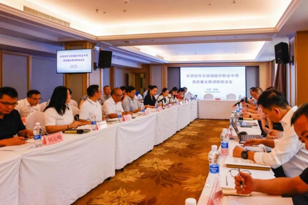 此次“东西协作支持瑞丽市职业中学高质量发展”是由教育部职成司、省教育厅、德宏州政府联合相关企业、高校一起开展。省教育厅、州政府办有关领导以及来自全国17所高校、企业的代表出席调研座谈会,并深入交流协作支持瑞丽职中的意义、路径和实践模式。邹丽表示,学校将全力支持瑞丽市职业中学人才培养工作,携手打造“国门产业贸易学院”,推动国门职业教育高质量发展。