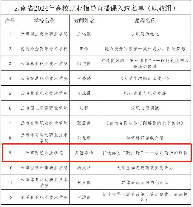 在本次活动中,我校大学生职业发展教研室的罗曌紫怡老师携《职业生涯规划》课程、直播课《打造你的“敲门砖”——求职简历的制作》成功入选云南省2024年高校就业创业指导金课及就业指导直播课!