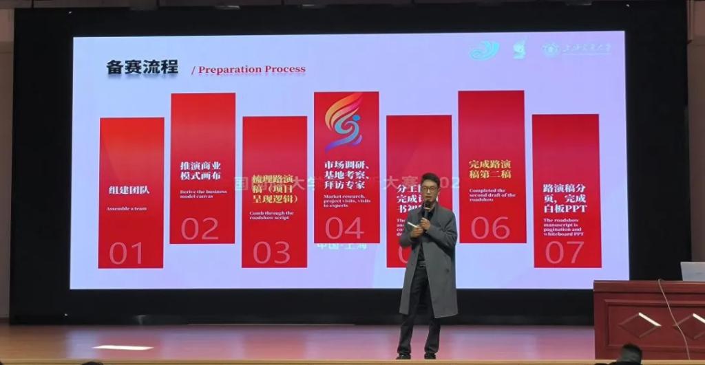 李承恩老师分享了创赛的选题与备赛的具体流程,通过引用经典案例,让学生们对参加创赛的好处、赛程安排以及奖项设置有了更加清晰的认知,他鼓励同学们积极参加各类创赛,激发了同学们的创新思维以及参加创新创业大赛的热情。