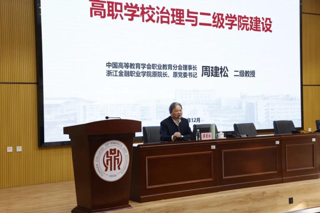 讲座由党委书记张金甫主持,特邀浙江金融职业学院原党委书记、我国高等职业教育领域知名专家周建松教授主讲。周建松教授长期深耕高等职业教育实践与研究,在学术研究、院校管理等多方面成果丰硕,兼任众多重要学术职务,曾荣获多项职业教育杰出校长奖。
