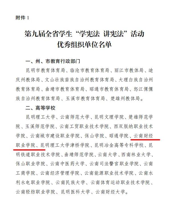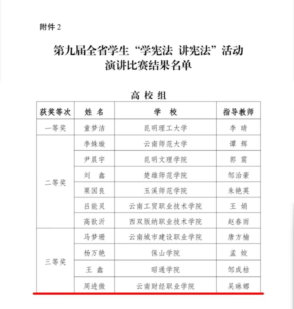 近日,云南省教育厅发布《第九届全省学生“学宪法 讲宪法”活动结果的通报》,我校荣获“优秀组织单位”,学校周进微同学获演讲比赛三等奖。