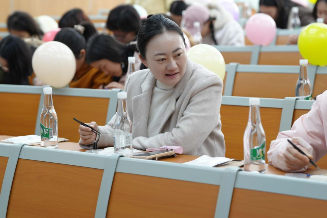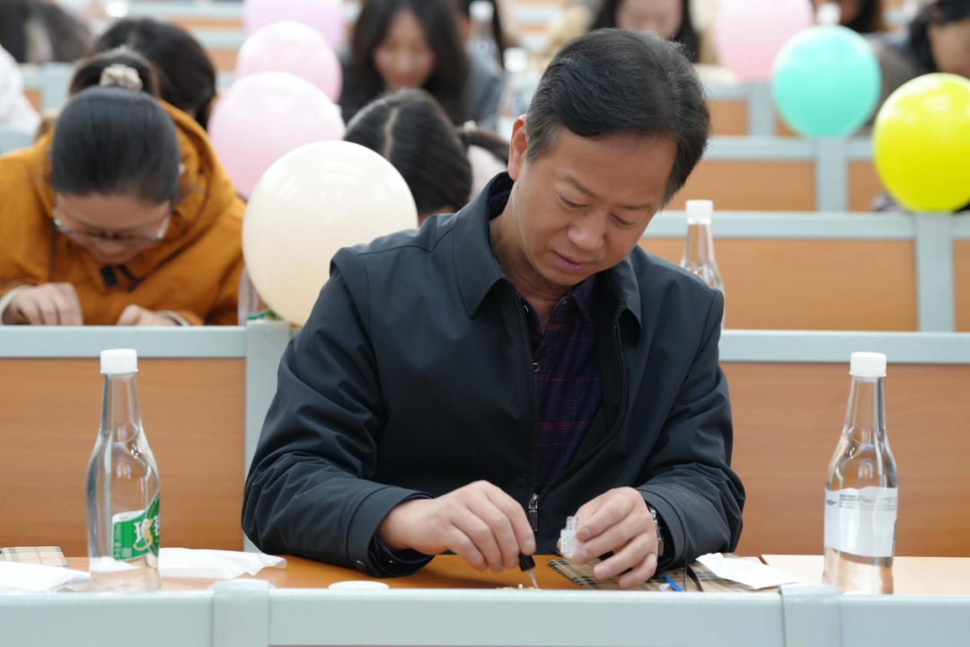 3月8日下午,学校阶梯教室热闹非凡,参加“非遗进校园——掐丝珐琅、螺钿创作”体验活动的女教职工们围坐一堂。学校党委副书记、工会主席仲新与全体女职工欢聚一堂。他充分肯定了女职工对学校发展的贡献,向她们表达节日的祝福,共度美好节日。
