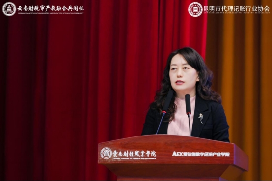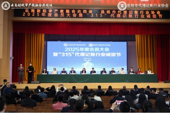 2025年3月15日,由云南财税审产教融合共同体与昆明市代理记账行业协会联合主办的“2025年度会员大会暨315代理记账行业诚信节”在云南财经职业学院大观校区举行。云南省教育厅职成教处、云南省财政厅会计服务中心、昆明市财政局、昆明市市场监督管理局、云南省职业技术教育学会、昆明市代理记账协会相关领导及云南财经职业学院党委副书记、校长邹丽出席会议。此次活动吸引了来自政府部门、行业协会、院校、企业的众多代表,大家齐聚一堂,共同探讨云南财税审行业产教融合新模式,校企协同育人新路径,共绘职业教育产教融合发展新蓝图。