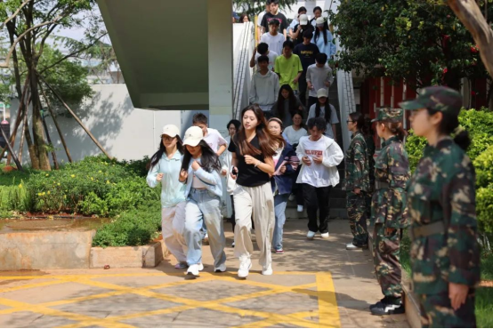 地震应急避险实战演练过程中,随着警报声响起,师生立即进入应急状态,迅速采取“伏地、护头、抓固”的避险姿势,随后在安全员指挥下按既定路线有序疏散至达观广场集结区。演练成效显著,警报响应迅速,疏散有序高效,各环节衔接顺畅,人员应急避险技能提升,安全意识明显增强。