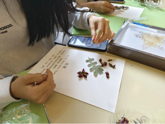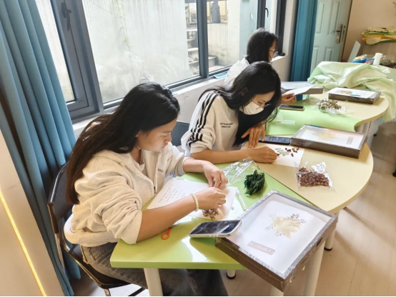 在干花标本创作教学环节,老师从色彩搭配原理、构图美学技巧等维度进行悉心指导。同学们手持形态各异的干花材料,发挥创意巧思精心设计,将个人审美意趣与内心情感倾注于作品之中,在修剪、拼贴、定型的过程中沉浸式感受