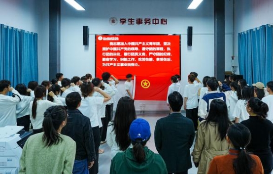 入团仪式上,校团委负责人宣读了新发展团员名单,今年上半年共有310名优秀青年经过严格培养和考核,光荣加入中国共青团。在领誓人的带领下,新团员面向团旗庄严宣誓,彰显了青年学子坚定不移听党话、跟党走的信念。校领导和各二级学院党支部书记为新团员佩戴团徽并寄予了希望,一枚枚闪耀的团徽承载着责任与担当,激励新团员以青春之我书写奋斗篇章。