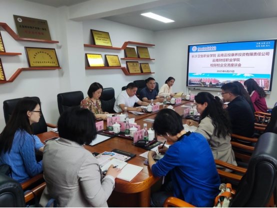 长沙卫生职业学院党委委员、纪检书记佘跃柱携护理学院及老年保健与管理专业相关负责人,对长沙卫生职业学院护理学院和护理专业发展、就业、专升本等学校情况进行介绍。云南云投康养投资有限责任公司代表从行业发展、行业环境、校企合作、产教融合、专业认知教育等方面介绍企业情况。