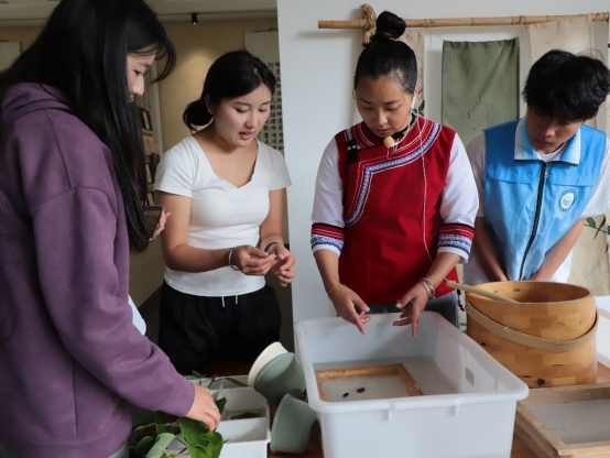 次日,师生们走进白棉纸体验中心与云南银器博物馆。在抄纸竹帘的滤水声中,体验煮料、抄纸等古法工序,感受“薄如蝉翼、韧似丝绸”的白棉纸魅力;在甲马制作环节,亲手拓印图案,触摸民俗文化的温度。博物馆里,从早期粗锻到当代精雕的银器展品,串联起鹤庆工艺的千年脉络。