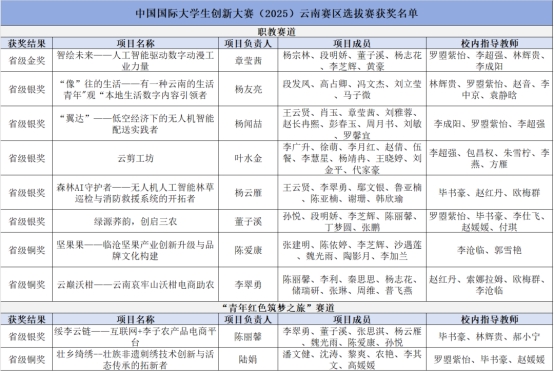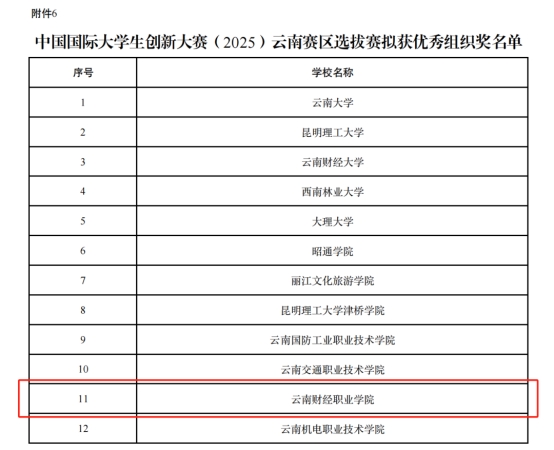 继荣膺大赛“优秀组织奖”后,云南财经职业学院在2025中国国际大学生创新大赛云南省赛决赛中再传捷报:经大赛公示,我校选送的12个晋级省级复赛项目共斩获10项大奖,包括职教赛道金奖1项、银奖5项、铜奖2项;红旅赛道银奖1项、铜奖1项。