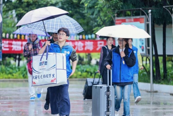"同学,行李给我!""家长请到休息区避雨!"志愿者化身"移动路标",他们抱着比自己还高的行李箱健步如飞,在宿舍楼和报到点之间往返数十趟,他们举着定制手举牌,把迷路的新生领到正确目的地。