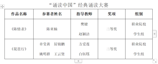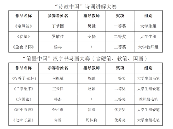 经省教育厅组织专家评审,从全省各地各校选拔的1345个经典诵读作品、1730个汉字书写作品、1120个诗词讲解作品进入省级复赛,分别评选出1184个经典诵读获奖作品、1363个汉字书写获奖作品、1086个诗词讲解获奖作品。学校10项参赛作品全部获奖,首次获得一等奖2项,具体名单如下: