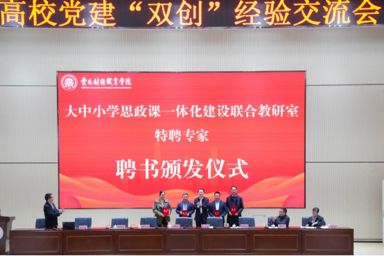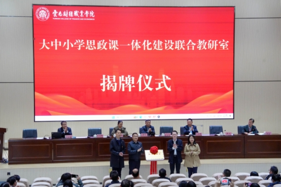 为构建“全学段贯通”的思政课建设协作平台和“全资源共享”的思政育人体系,云南财经职业学院联合云南财经大学马克思主义学院、昆明市盘龙区财大附中、昆明市盘龙区云才文翰学校共同成立“大中小学思政课一体化建设联合教研室”。张金甫与联办学校领导共同为教研室揭牌,并为中央财经大学马克思主义学院院长黄刚、全国高校思政名师工作室主持人阮金纯、云南警官学院马克思主义学院院长陈明珍、云南财经大学马克思主义学院院长宁乐锋颁发联合教研室特聘专家聘书。