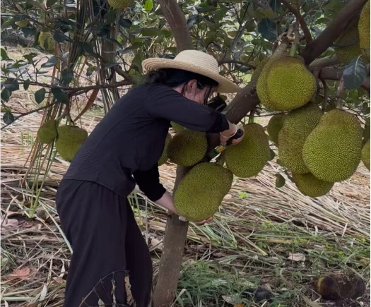 白天的菠萝蜜园是我的“片场”,扛着三脚架在果树间钻来钻去,裤脚沾满泥点也顾不上擦。选果是个细致活,必须挑表皮泛黄、按下去微微发软的,这样的果子才够甜够糯。调试镜头更得下功夫,我反复调整角度,既要拍出满枝硕果的壮观全景,又要抓准直播时切开果肉的瞬间。