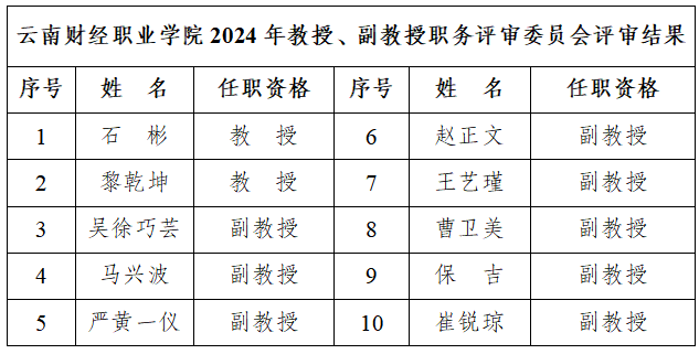 经云南财经职业学院教授、副教授职务评审委员会于2024年10月27日评审,同意石彬等2名同志具备教授任职资格、吴徐巧芸等8名同志具备副教授任职资格。
