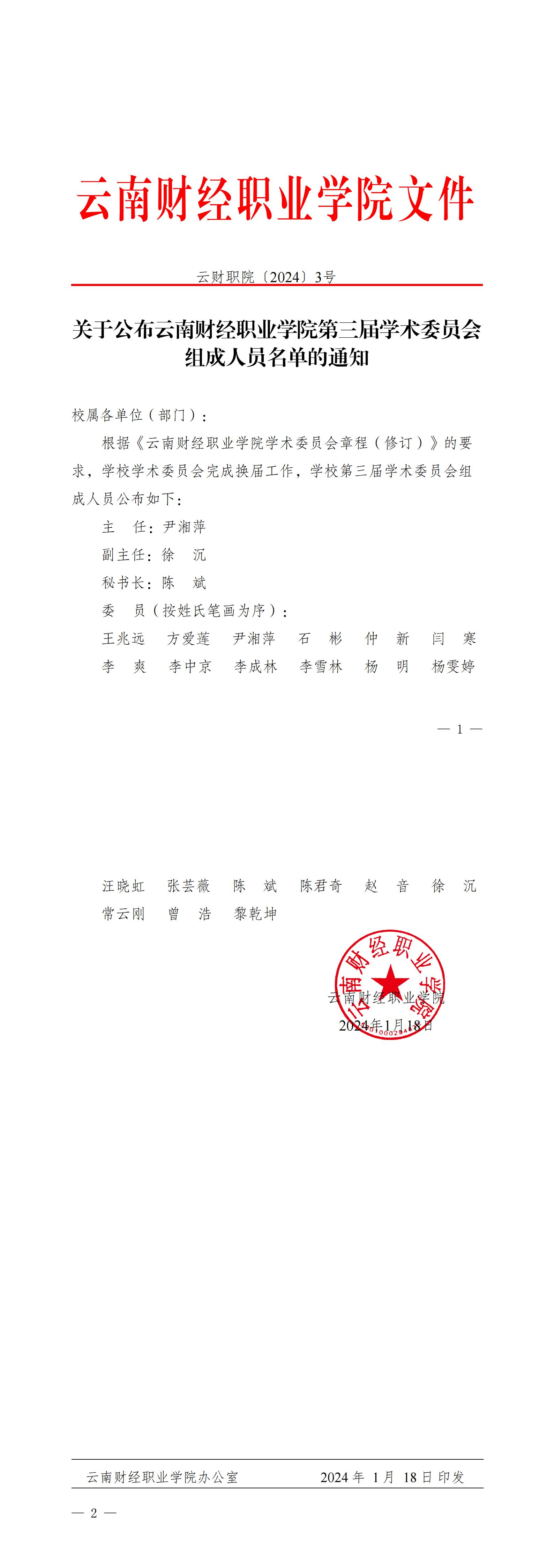 关于公布云南财经职业学院第三届学术委员会组成人员名单的通知