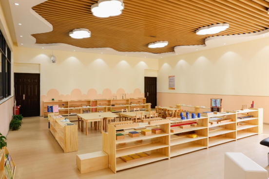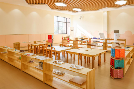 婴幼儿混龄教育融合实训室以儿童为中心,根据幼儿自身发展的敏感期,提供丰富的教具,创设日常生活、感官教育、数学思维、语言、科学文化教育五大区域,让幼儿通过感官体验、动手操作和自主学习来发展个人潜能。