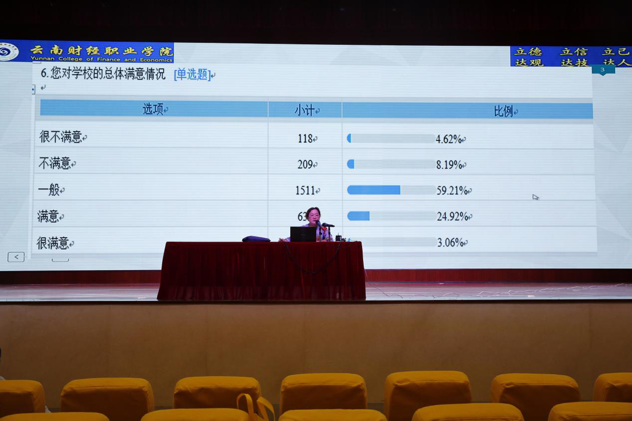 随后,沈豫琼副院长对学校刚结束的“在校生满意度调查”进行了通报。此次调查涵盖了学校评价、专业教学服务、学生服务管理和后勤保障服务四个方面,共78道题,对在校的2758名同学进行问卷调查,回收有效问卷2552份。