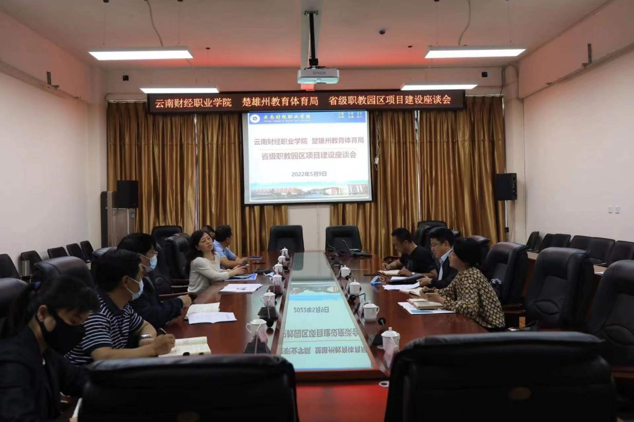 2022年5月9日,学校与楚雄州教育体育局在财苑楼举行省级职教园区项目建设座谈会。楚雄市人民政府副市长李智才,禄丰市人民政府副市长夏颖,楚雄教育体育局副局长何云海;学校党委书记张金甫,党委副书记、校长邹丽,副校长刘宁飞以及学校办公室、发展规划与质量保证办公室、后勤服务中心、基建办公室等部门负责人参加会议。座谈会由刘宁飞副校长主持。