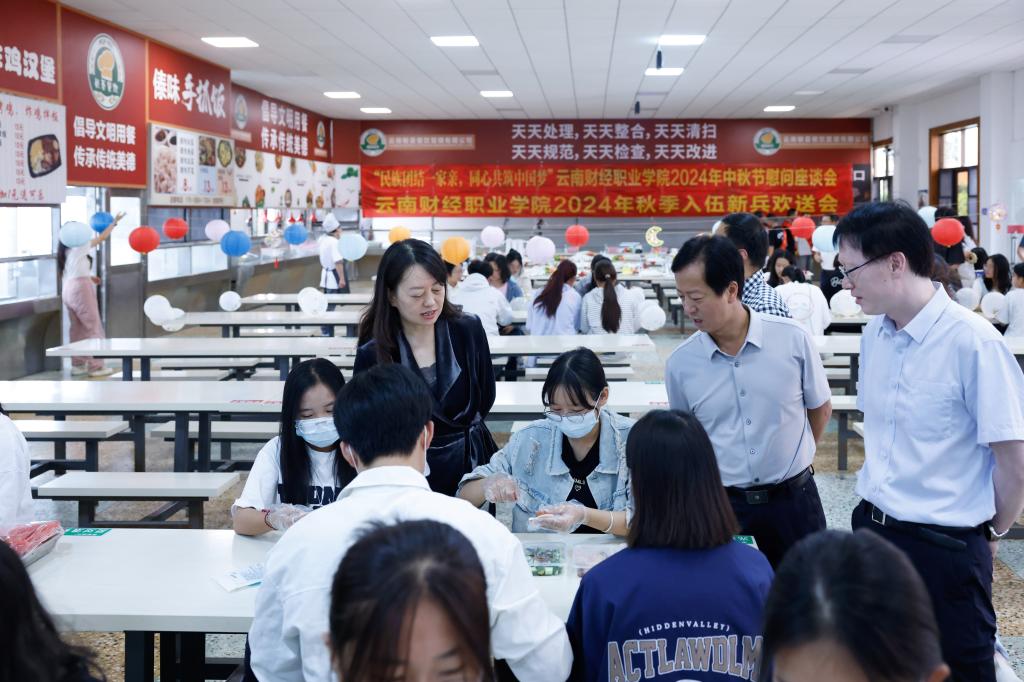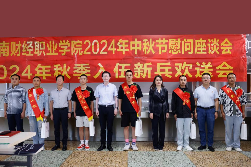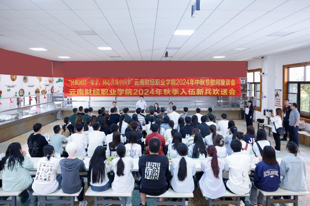 为进一步铸牢中华民族共同体意识,做好新时代党的民族团结工作,继承和弘扬爱国拥军的光荣传统,2024年中秋佳节到来之际,云南财经职业学院在龙泉校区开展“民族团结一家亲”中秋慰问座谈会暨秋季入伍新兵欢送会。