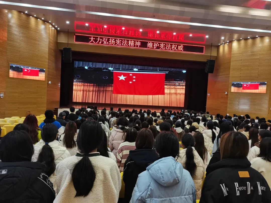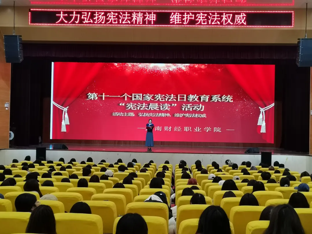 为深入学习贯彻党的二十大、二十届三中全会和全国教育大会精神,加强宪法法治教育,按照《云南省教育厅关于开展2024年全省教育系统宪法宣传周暨学校法治宣传教育月活动的通知》要求,结合学校实际,12月4日,由云南财经职业学院学生处主办,易表仁财工作站承办的宪法晨读及观看普法网直播活动在学校大礼堂顺利开展。