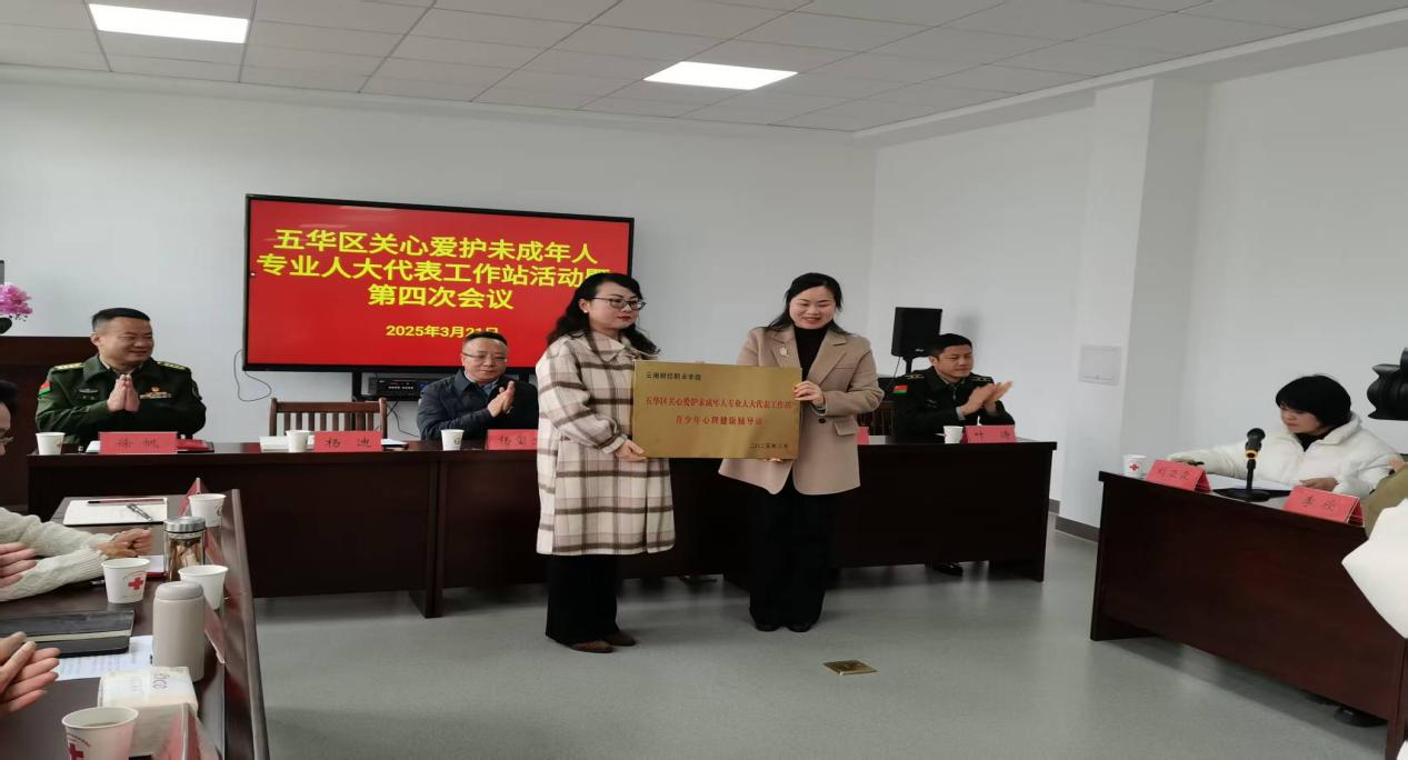 参会人员观摩了九二〇医院五华院区心理健康咨询治疗中心;随后召开人大代表工作站第四次工作会议。会议增补云南财经职业学院副校长严黄一仪为人大工作站副站长;成立了普法专家志愿者队伍和心理咨询专家志愿者队伍;会议决定,在九二〇医院五华院区设立“五华区关心爱护未成年人专业人大代表工作站青少年心理健康服务站”,在云南财经职业学院设立“五华区关心爱护未成年人专业人大代表工作站青少年心理健康辅导站”并授牌。