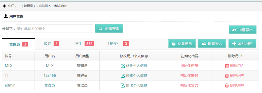 2. 后台管理员登录,登录地址:172.16.39.248:8001,初始管理员账户名称admin,密码123456(密码可在个人中心修改),进入后点击“批量导入”按钮下载教师和学生信息模板: