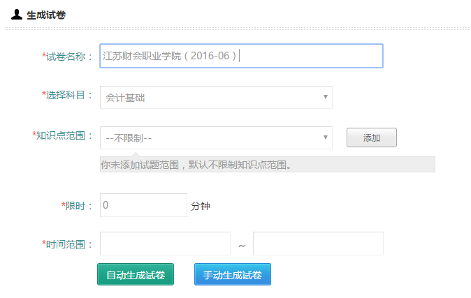 5. 老师在后台以管理员或教师身份登录,可以对做题目导入、修改、考试布置等多种操作,由于系统本身配置模拟题,所以通常老师后台管理中使用的功能是布置考试和考试成绩查询,布置考试的界面如下:
