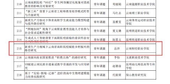 近日,云南省教育厅公示了2025年度云南省教育科学规划课题拟立项名单,我校教师岳洋的《新质生产力视域下云南省高职院校赋能乡村振兴的路径研究》项目喜获青年课题立项。该课题拟通过解构新质生产力“高科技、高效能、高质量”的特征与云南乡村振兴需求的适配逻辑,探索高职院校在教育教学改革、人才培养、产教融合等领域的赋能路径,旨在推动职业教育与乡村发展深度融合,为云南边疆地区乡村振兴提供具有实践基础和政策参考价值的实施策略。项目负责人岳洋于2023年5月至2025年6月在临沧市耿马县色树坝社区开展乡村振兴驻村工作,积累了丰富的一线实践经验和真实案例数据。