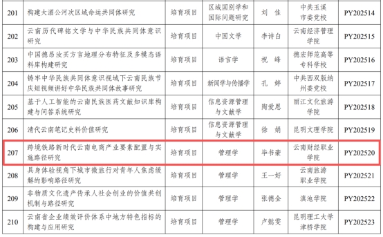 此前,中共云南省委宣传部办公室发布《关于下达2025年云南省哲学社会科学规划年度项目立项名单的通知》,我校教师毕书豪的项目《跨境铁路新时代云南电商产业要素配置与实施路径研究》喜获青年项目立项。该项目拟聚焦中老铁路开通后的区域经济变革展开研究,以期为云南跨境电商协同发展提供决策参考,力求彰显学校服务“一带一路”倡议的学术担当。