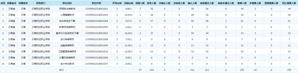 云南财经职业学院2020年事业单位公开招聘工作人员报名情况统计(截止7月2日18:00)