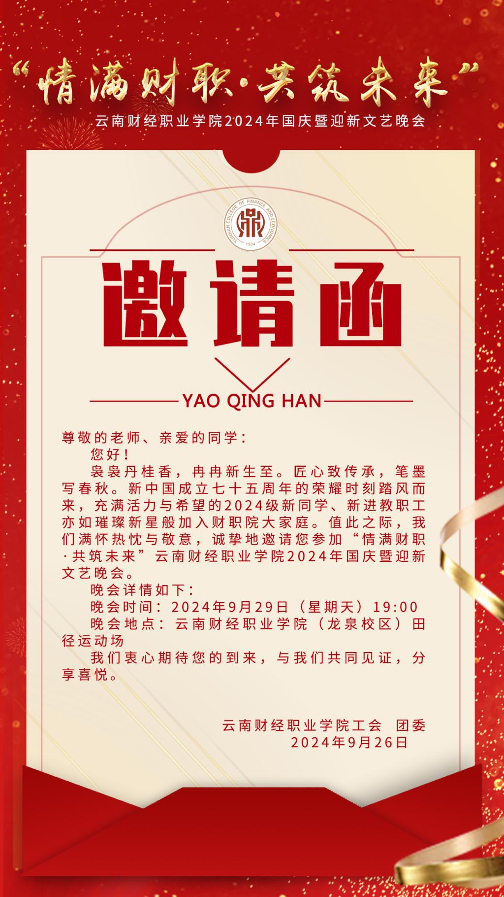 9月29日,“情满财职·共筑未来”云南财经职业学院2024年国庆暨迎新晚会在我校龙泉校区田径场隆重举行。师生们欢聚一堂,共同庆祝祖国的生日,迎接新同学、新教职工的到来。