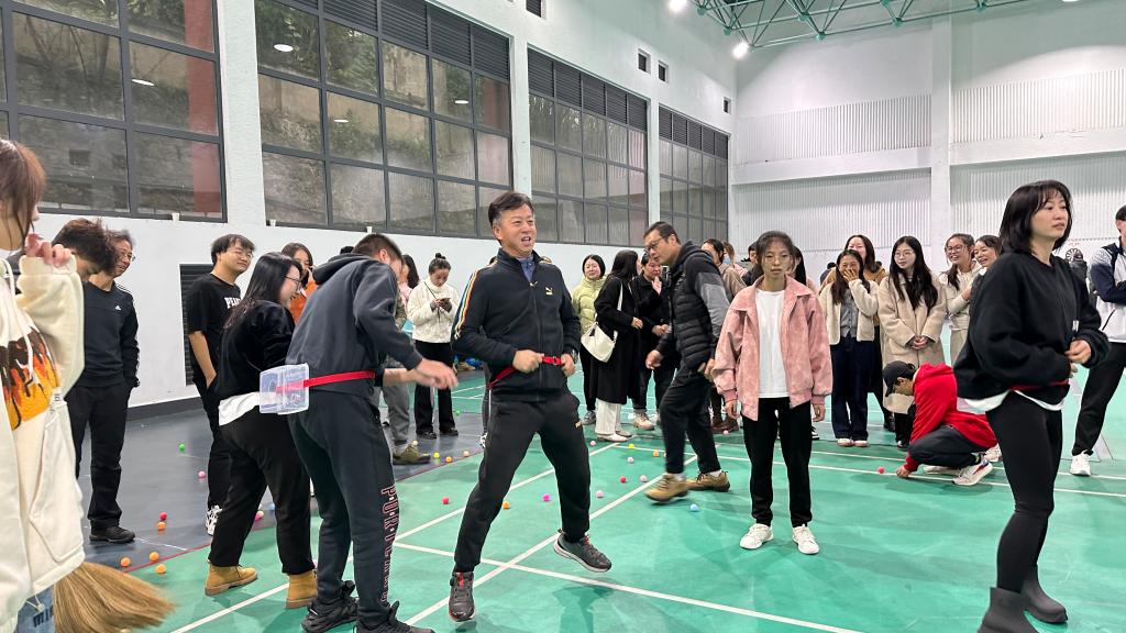 “公鸡下蛋”项目则是欢乐满满。老师们腰间绑着道具,通过各种有趣的动作让“鸡蛋”掉落。现场欢笑声、加油声此起彼伏,大家都沉浸在这轻松愉快的氛围中。