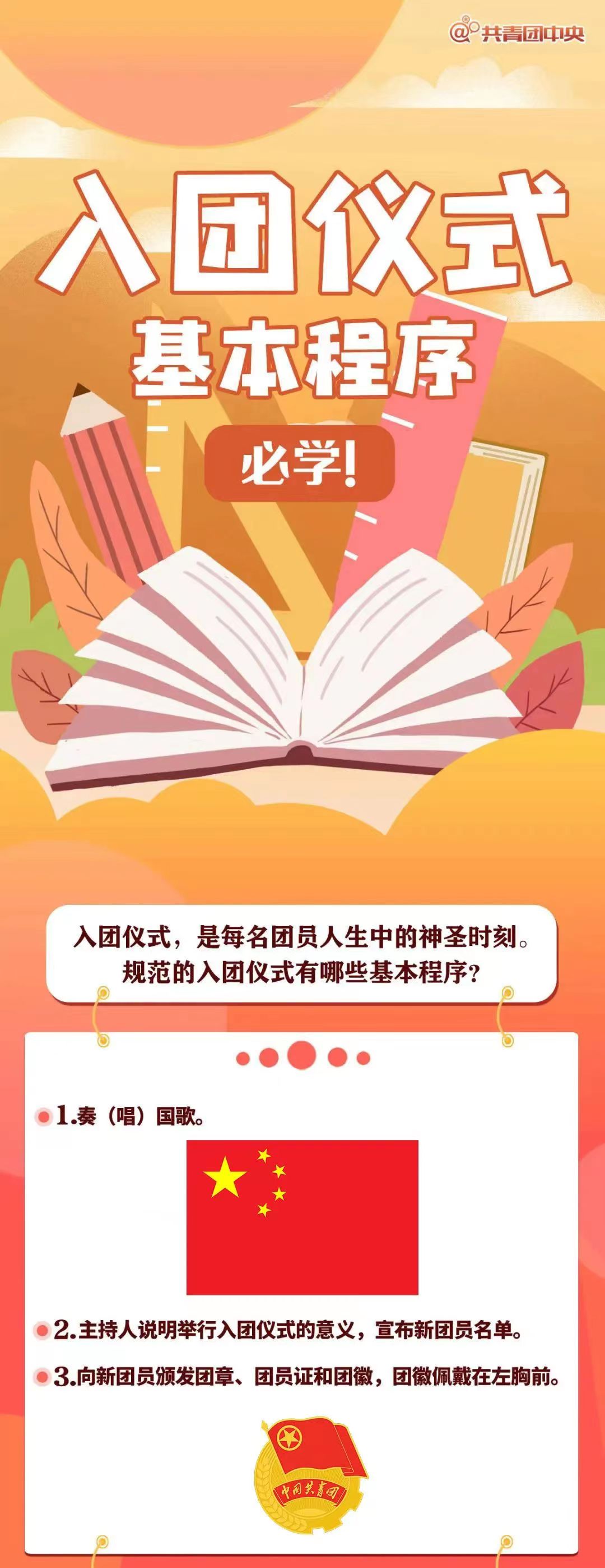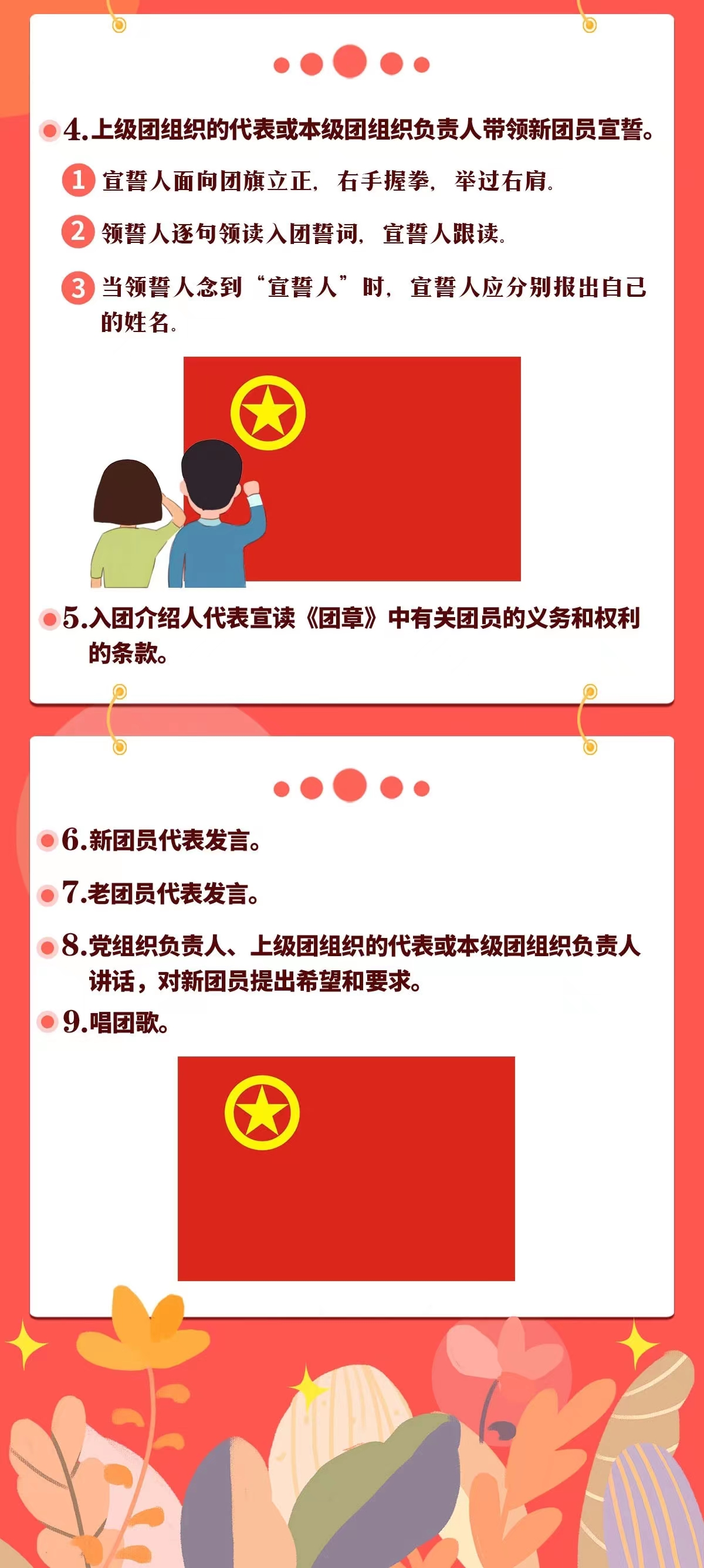 ——入团仪式由团的基层委员会、总支部委员会或支部委员会组织,团小组不能组织。可以邀请同级党组织负责人参加,一般还应吸收入团积极分子到场观摩。