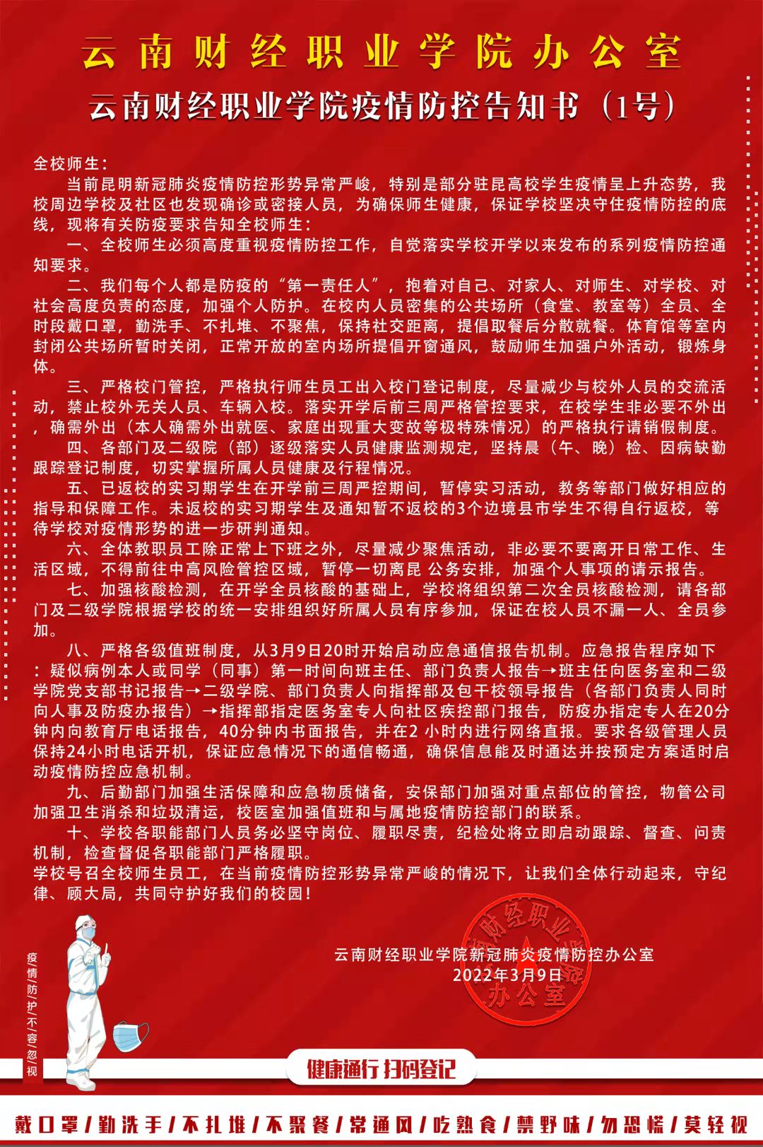 云南财经职业学院疫情防控告知书