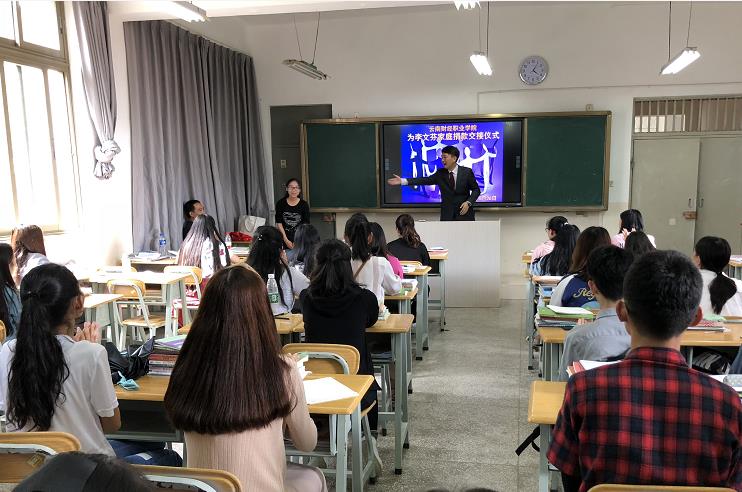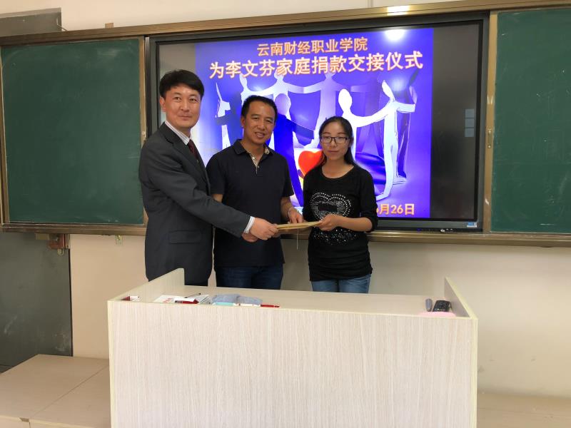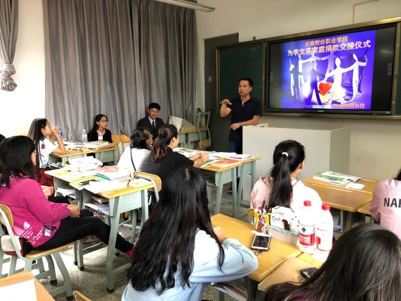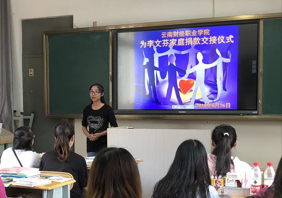 人间自有真情在,爱心捐款暖人心。2018年6月26日下午16点,“云南财经职业学院为李文芬家庭捐款交接仪式”在勤奋院教学楼409教室举行。校团委书记、财税金融系党支部书记、校团委宣传委员、团委委员、学委委员及各班团支书参加了交接仪式。