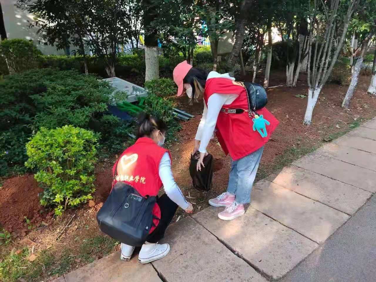 伴随着朝阳,在团委老师们的带领下,身穿红色志愿服的志愿者们手拿垃圾钳、垃圾袋、扫帚等工具,开始了对公园卫生清理工作。志愿者们奔波在公园的各个角落,认真细致的将草坪、路边、树坑、花台里的垃圾捡拾干净。活动从早上 8 点开始,一直持续到了 11 点。