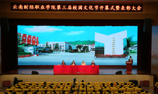 5月18日下午两点三十分,第三届校园文化节开幕式暨表彰大会在本校报告厅盛大举行。在国歌的播放、同学和老师们高唱国歌声中拉开帷幕,团委李超强老师主持,由纪委书记杨红英宣读《云南财经职业学院2015-2016学年度学生评优评先表彰决定》、沈豫琼副院长宣读《关于表彰在2017年云南省高校学生技能大赛中取得优异成绩的选手、指导教师及系部的决定》、学校领导为获奖师生颁奖、获奖同学代表发言后、陶昌学院长致开幕词;此次晚会以激发同学们的青春活力与集体精神为宗旨,积极的调动起大学生们对学习和工作的认知态度以及一种热情、积极向上的精神风貌,随后李超强老师介绍了学校2016年征兵工作开展情况,同学们观看2017年征兵宣传片《中国力量》,为每位同学的大学生活描下了崭新绚丽的一笔记忆。