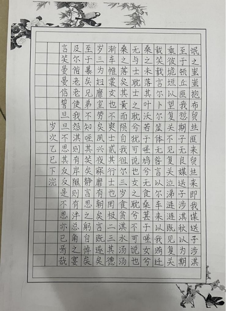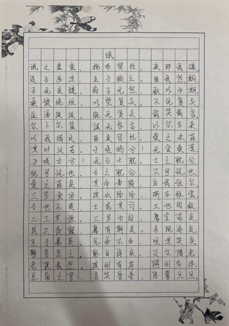 在硬笔书法赛道,同学们围绕“中国经典文学篇章”挥毫泼墨。他们刚劲有力的书写着《氓》等经典作品。