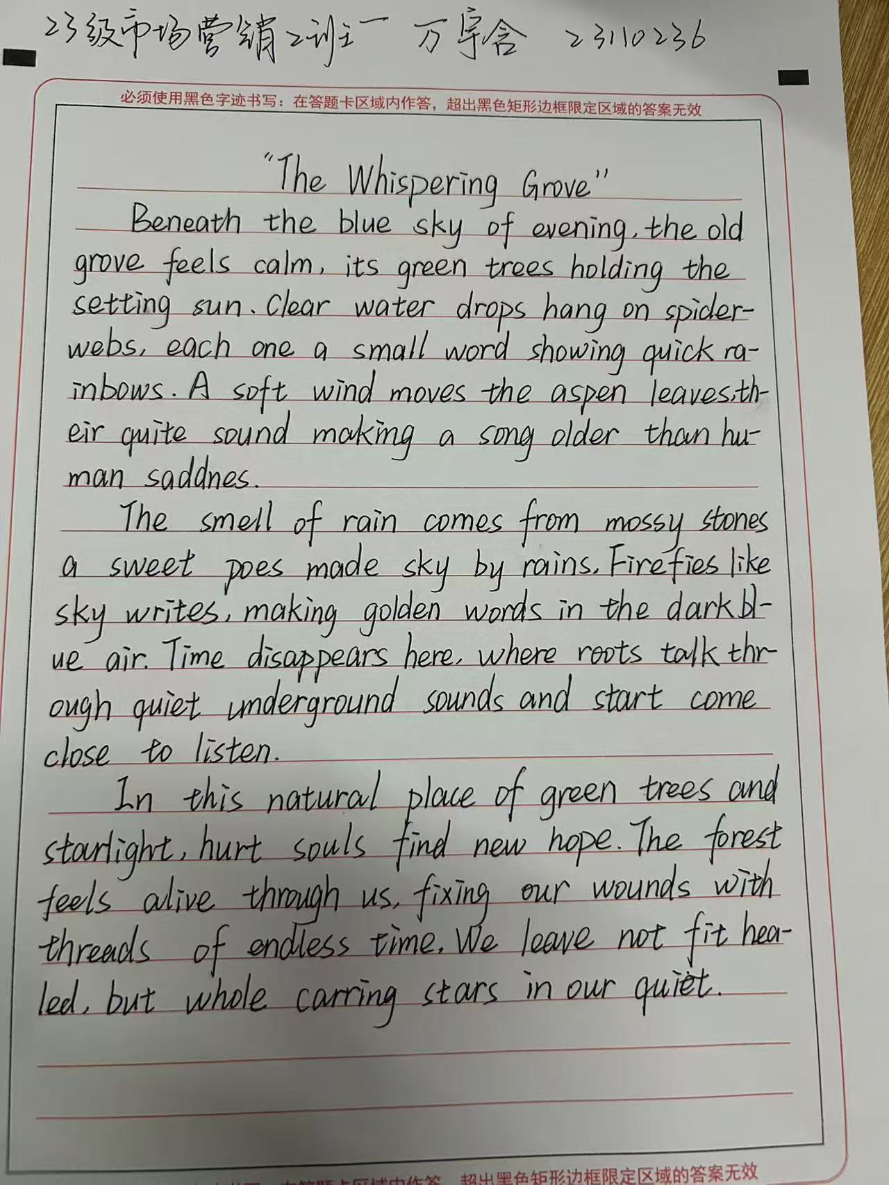 为进一步促进校园文化建设,弘扬中华民族传统文化,着力提升大学生的人文素养与书写技能。近日,校团委举办了“墨韵英风共展,文化交融幻彩”主题书法比赛以及书法展览活动。活动吸引了全校广大师生积极参与。活动当日,大观和龙泉两个校区共计 900 名同学同步参与初赛,现场氛围热烈非凡,成为校园文化艺术的一大亮点。