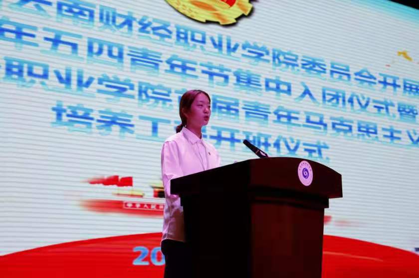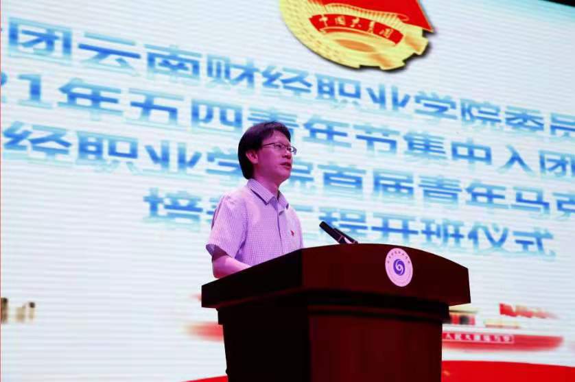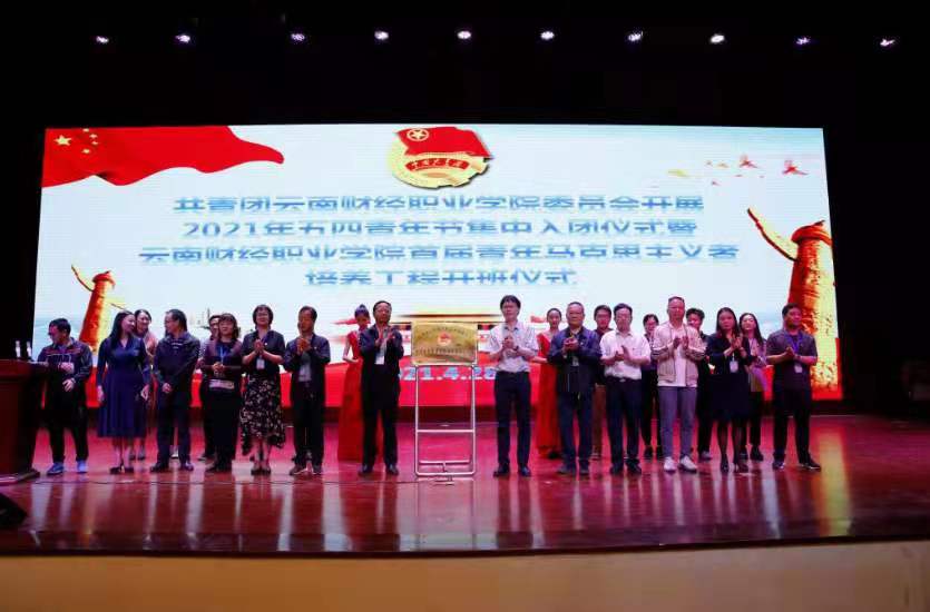 为深入学习贯彻习近平总书记在党史学习教育动员大会上的重要讲话精神,做到学史明理、学史增信、学史崇德、学史力行,紧密结合共青团工作和团员青年实际情况,坚持理论学习和实践教育相结合,根据《中共云南财经职业学院委员会关于开展党史学习教育的实施方案》、《共青团云南财经职业学院委员会组织开展“学党史、强信念、跟党走”学习教育的通知》、《云南财经职业学院“大学生青年马克思主义者培养工程”实施方案(试行)》,云南财经职业学院于2021年4月28日上午9时,学院青年马克思主义者培养工程开班暨“五四”青年节集中入团仪式在学校大礼堂举行。