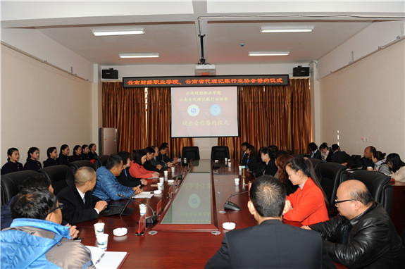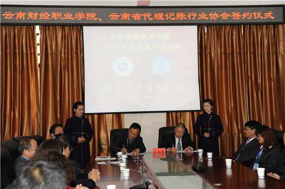 2017年3月3日上午10:00—12:00时在云南财经职业学院财苑楼三楼会议室举行“云南财经职业学院和云南省代理记账行业协会战略合作签约仪式”。出席此次签约仪式的相关领导有云南省财政厅会计处赵学源处长、杨婕副处长,昆明市财政局会计局考务培训处樊原明副处长,云南财经职业学院党委书记李思泽、院长陶昌学、副院长仲新、副院长沈豫琼,云南省代理记账行业协会会长王晶、副会长孙辉、谷明萍等相关领导。此次签约仪式由我院仲新副院长主持。参加本次签约仪式的媒体有腾讯、春城晚报、今日头条、网易、搜狐五家媒体公司。