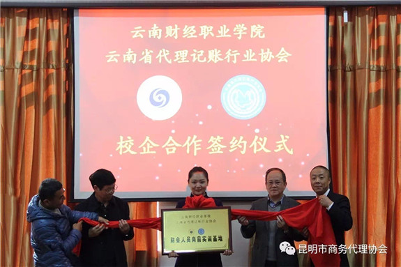 由云南省财政厅会计处赵学源处长、学院李思泽书记、昆明市财政局会计局考务培训处樊原明副处长、云南省代理记账行业协会王晶会长为此次校协合作项目进行揭牌。