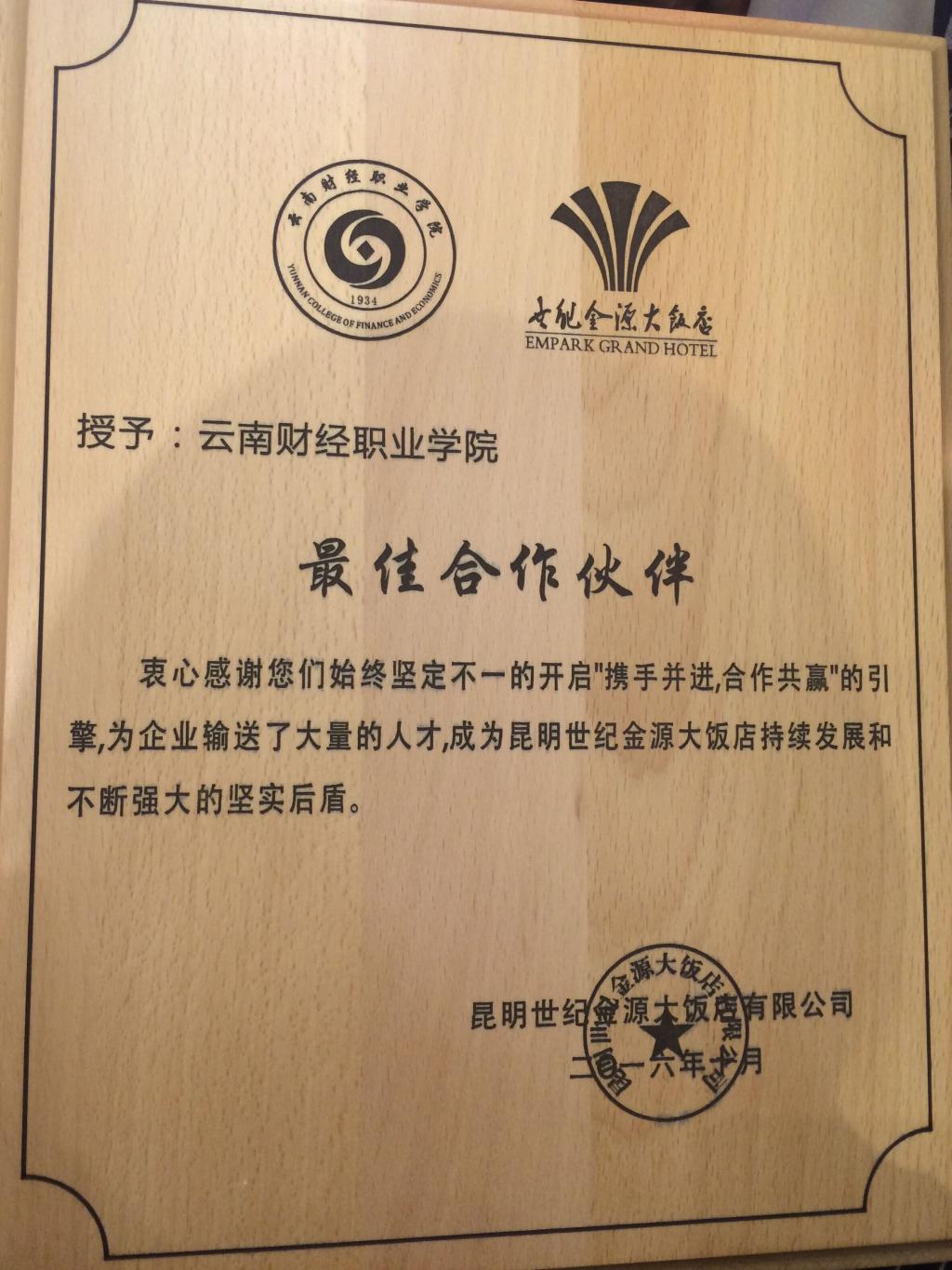 携手并进,合作共赢--我校成为昆明世纪金源大饭店“最佳合作伙伴”