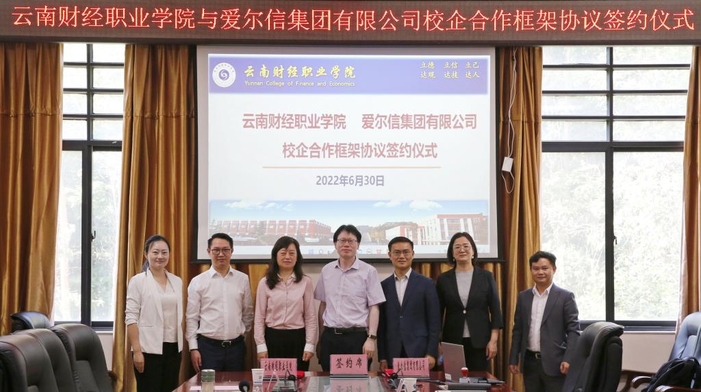 6月30日上午,我校与爱尔信集团有限公司举行校企合作框架协议签约仪式。党委书记张金甫,党委副书记、校长邹丽,副校长沈豫琼、副校长严黄一仪,爱尔信集团董事长毛良、执行总裁余强、副总裁毛建友出席签约仪式。