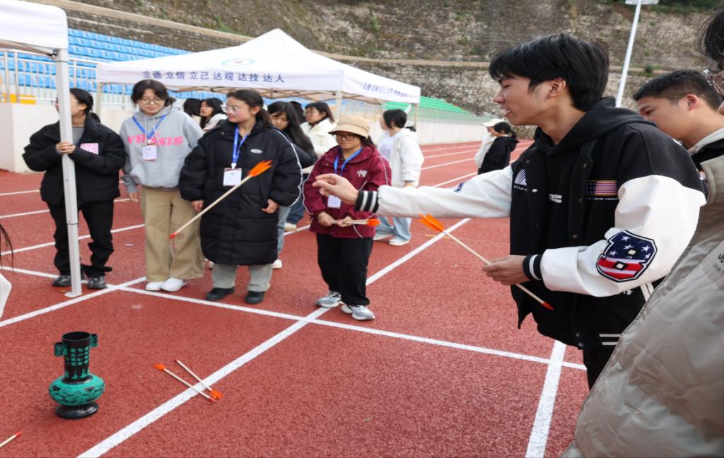 活动紧扣“趣味竞技、文化浸润、团队凝聚”三大核心,精心设置6项特色游戏,多维度展现青春风采。“蒙眼作画”让参与者在黑暗中迸发创意,用指尖勾勒心中图景,考验空间感知与想象力;“筷子夹弹珠”于方寸之间比拼手眼协调,在专注中锤炼耐心与细致;“投壶”游戏复刻传统民俗,让同学们在躬身投矢间感受中华优秀传统文化的魅力;“危险你唱吗”将歌声与肢体表达巧妙融合,在欢声笑语中拉近距离、释放真我;“团史知识接力”以答题拼图为载体,把红色故事、团史常识融入竞技,让红色基因在协作答题中代代相传;“轻趣绳舞·默契闯关”则通过双人同步跳绳,让默契在跃动中升温,让团队精神在协作中凝聚。各游戏区域秩序井然,工作人员全程贴心引导、细致服务,为同学们打造了沉浸式、高品质的活动体验。