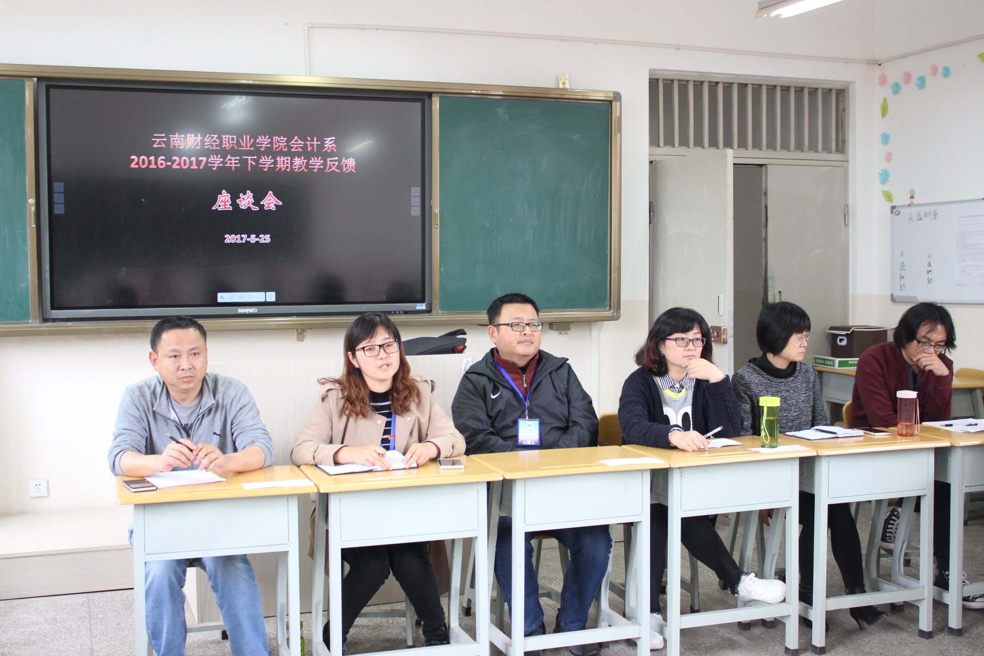 本次会议共分为三个流程,第一个流程是尹主任介绍各参会的教师代表,第二个流程是由各班代表就本学期以来会计类课程的教学提出意见和建议,第三个流程是学生自由发言,就学习、教学、后勤等方面畅所欲言、谏言献策。